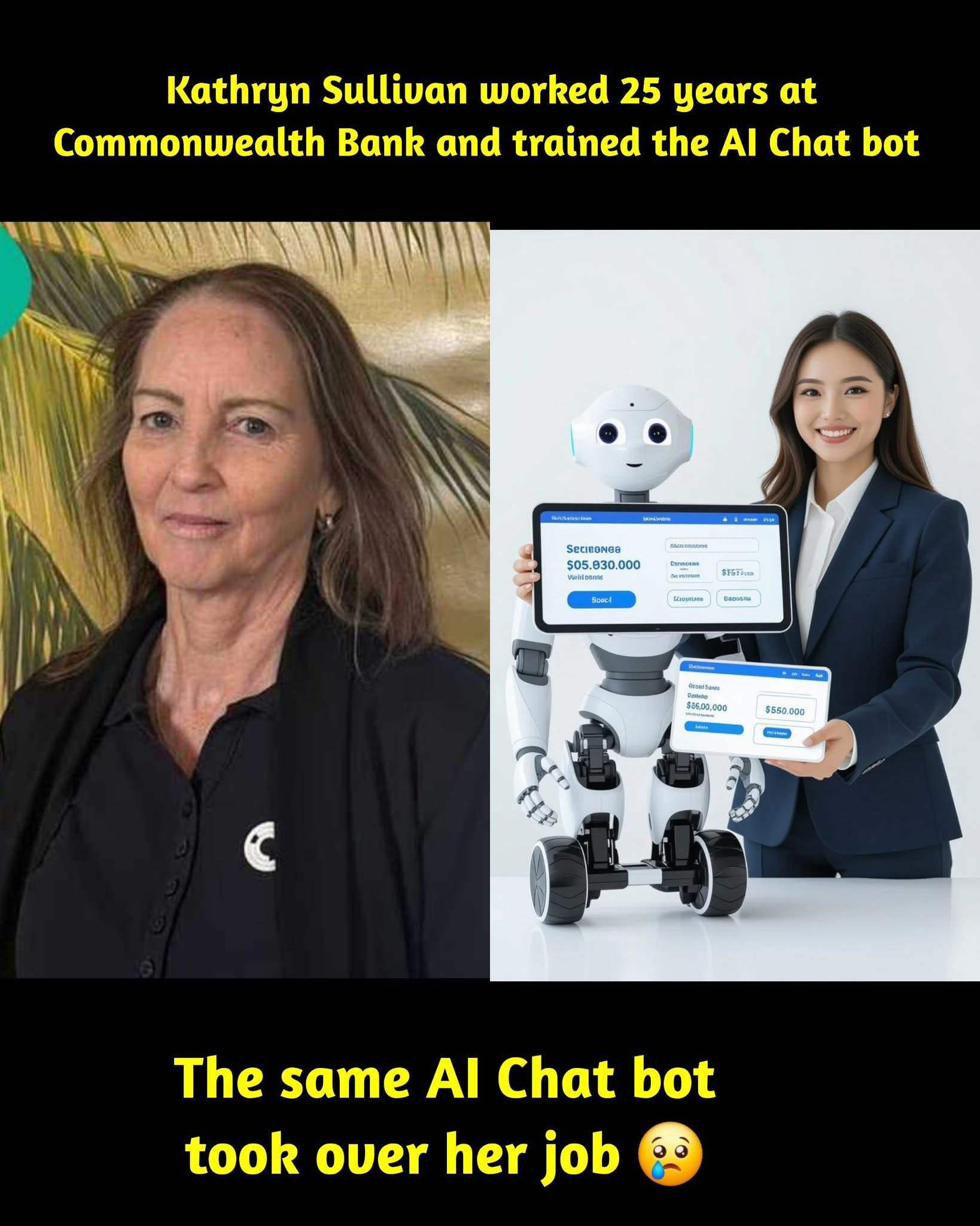 This is the true story of Kathryn Sullivan, a woman who gave 25 years of her life to the Commonwealth Bank of Australia. She worked hard, trained staff, and even helped teach their AI chatbot how to answer customer questions.